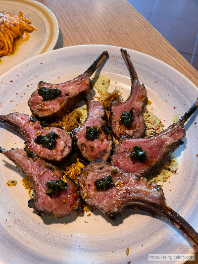 너무너무너무 부드러운 양고기 프렌치렉에 명이나물 다져서 올리고 밑에는 쯔란과 마요소스, 캐러멜라이즈드된 양파가 있어서 이 조합이 정말... 맛있었다 (온점)