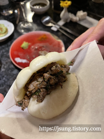 고기를 다 먹고 나면 양 불고기를 구워 쫄깃한 빵 사이에 껴서 햄버거처럼 먹을 수 있게 주신다.