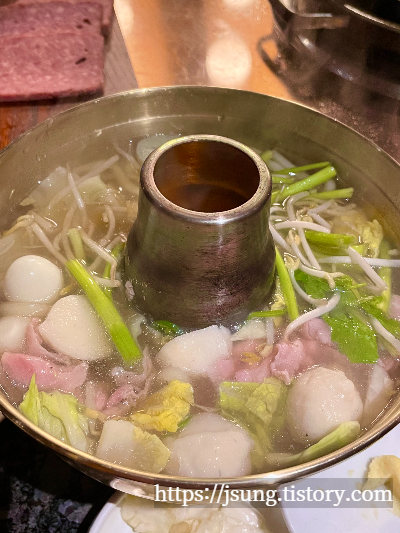 다음은 양 샤브샤브가 나오는데, 맑은 육수에 완자, (사랑하는) 미나리, 숙주, 배추 등이 나오고 우동사리를 3000원에 추가할 수 있다. 우동사리 정말 필수! 샤브샤브랑 거의 동시에 양 스팸을 구워서 밥에 올려서 주시는데, 배가 불러도 이 조합은 잘 들어간다. 양 스팸은 신선해서 좋았음